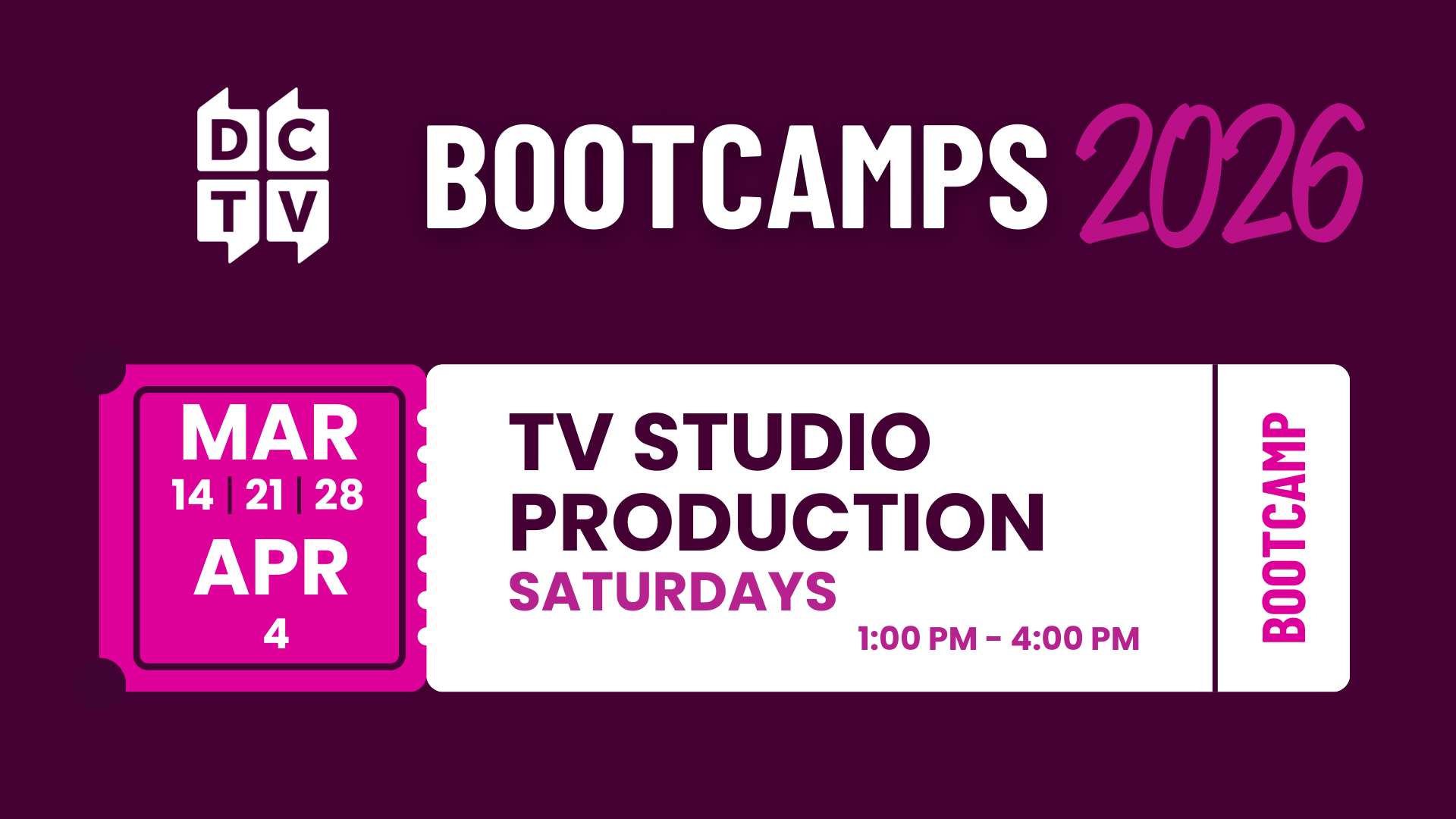 This bootcamp teaches the essential technical skills used in live‑to‑tape studio production inside DCTV’s newly renovated studio. Over four weekly sessions, you’ll rotate through key studio and control room positions—learning how to operate PTZ (robotic) cameras, run audio, manage graphics, use the teleprompter, floor direct, and work with turnkey overhead lighting. You’ll gain hands‑on experience with the full production workflow and demonstrate your skills during mock productions.